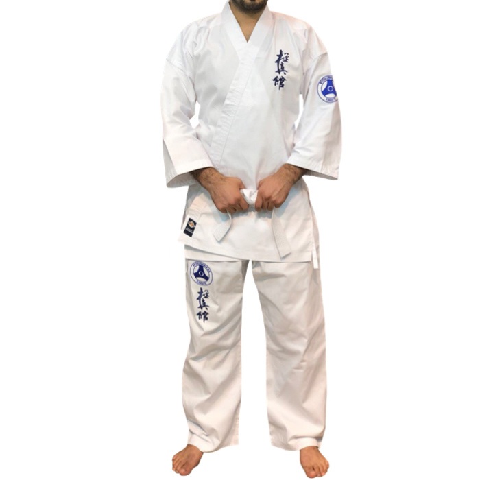 Made out of unbleached cotton with Kyokushin embroidery on the left part of the chest. The canvas jacket reaches halfway down the thigh with ¾ sleeves. The pants, made from lightweight twill cotton, feature long legs and a drawstring at the waist.