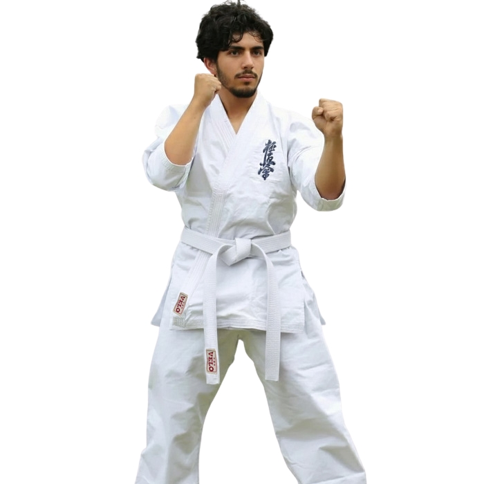 Made out of unbleached cotton with Kyokushin embroidery on the left part of the chest. The canvas jacket reaches halfway down the thigh with ¾ sleeves. The pants, made from lightweight twill cotton, feature long legs and a drawstring at the waist.