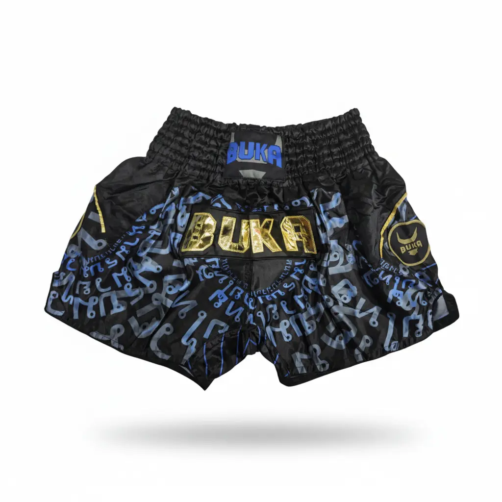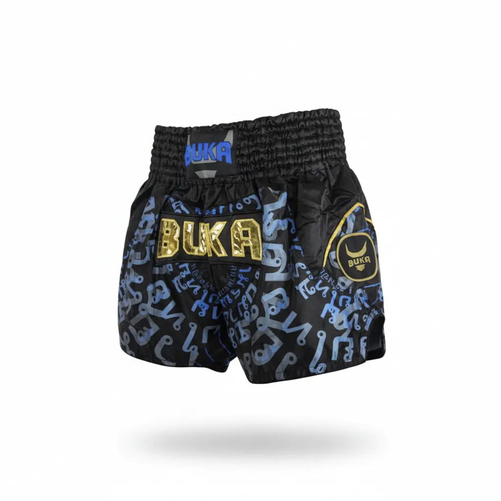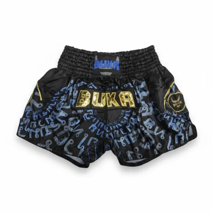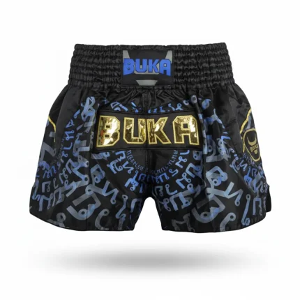 شورت موي تاي BUKA الاحترافي مصمم خصيصاً للمقاتلين والرياضيين الذين يبحثون عن أداء استثنائي في التدريب والمنافسات. يتميز هذا الشورت بتصميم عصري فاخر يجمع بين اللون الأسود الأساسي مع نقشة حروف باللون الأزرق والرمادي، مع شعار BUKA المطرز بالخيوط الذهبية البارزة وشارة مميزة على الجانب.
